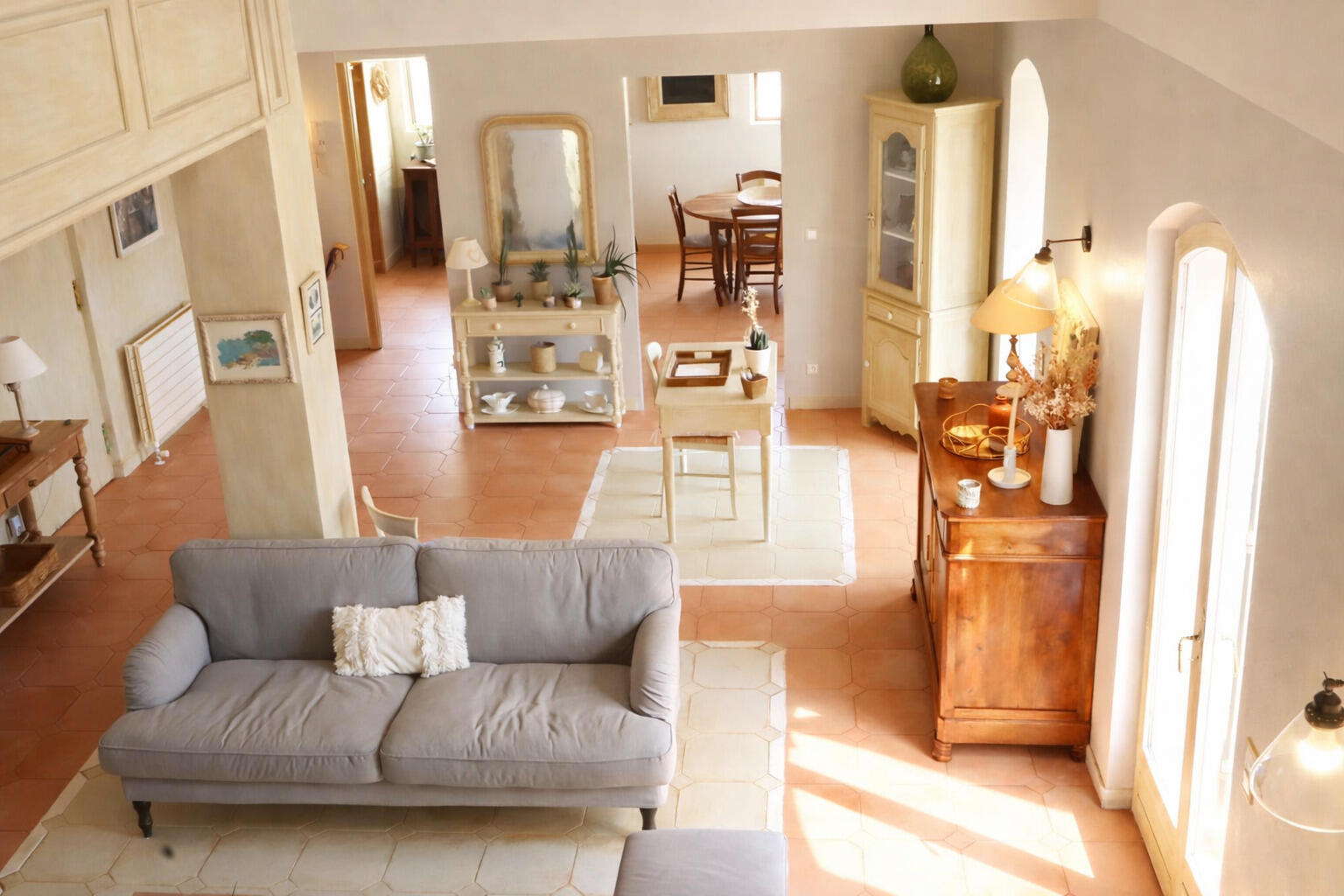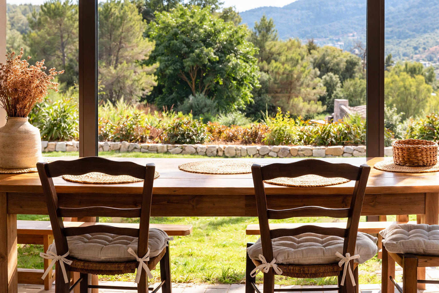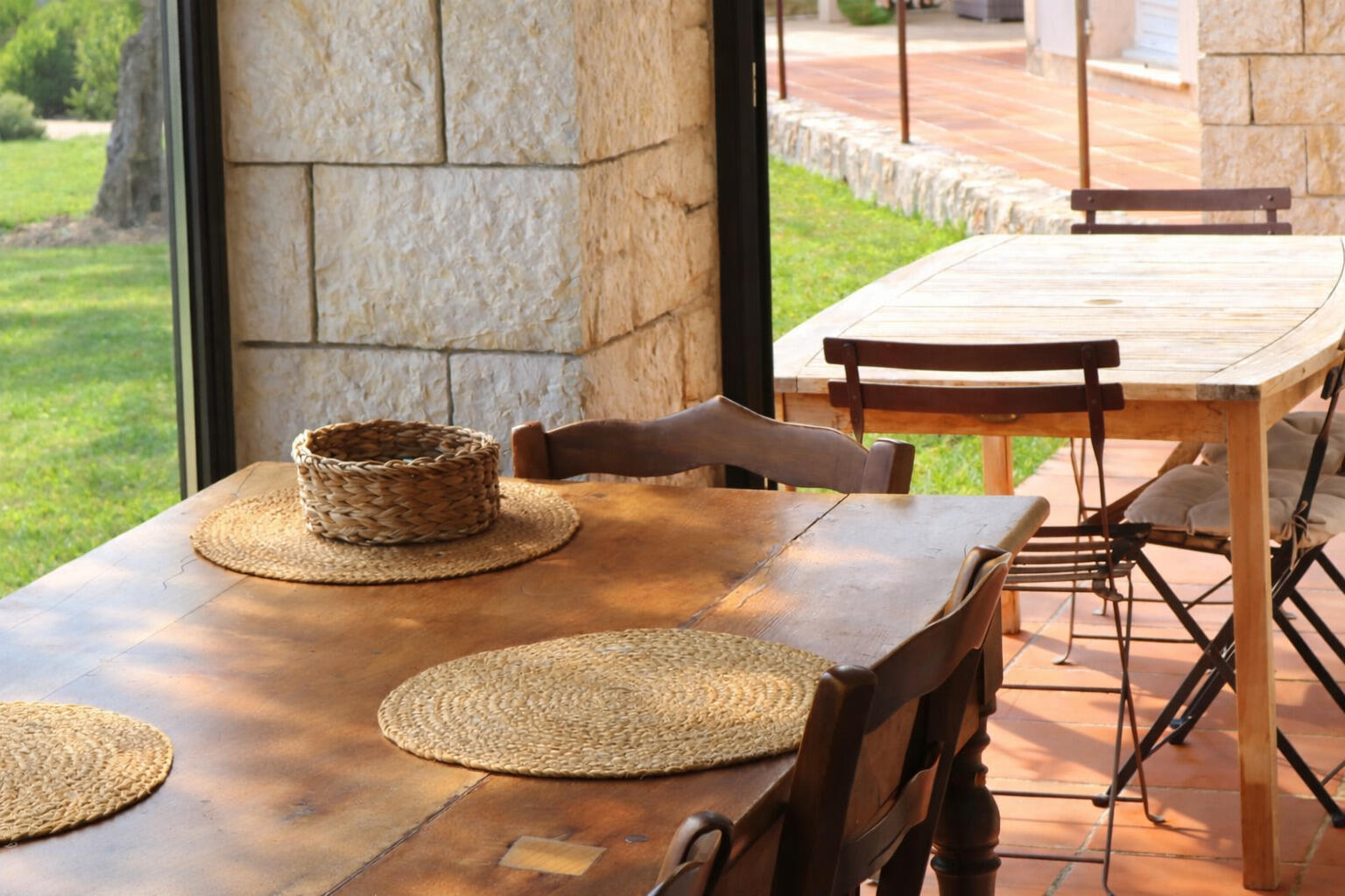 – Un espace de vie extérieur couvert, bordé d’oliviers.