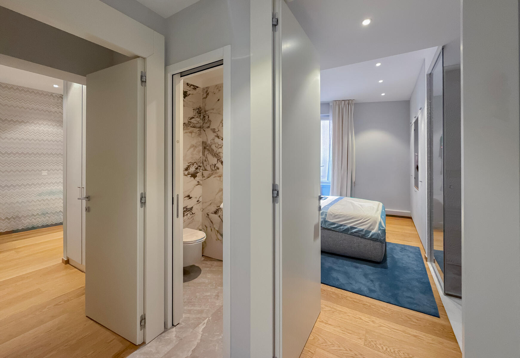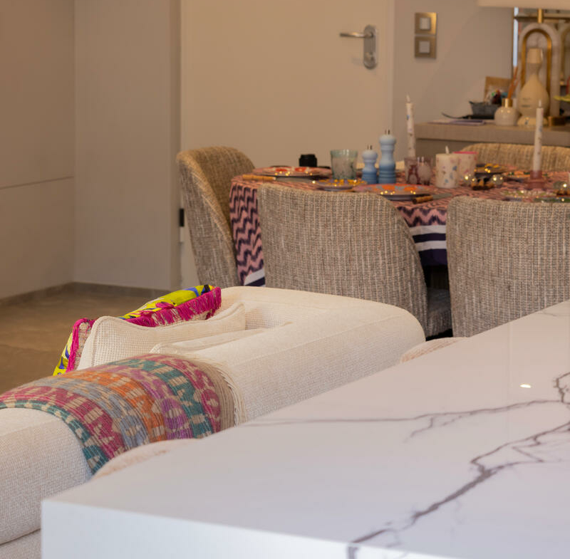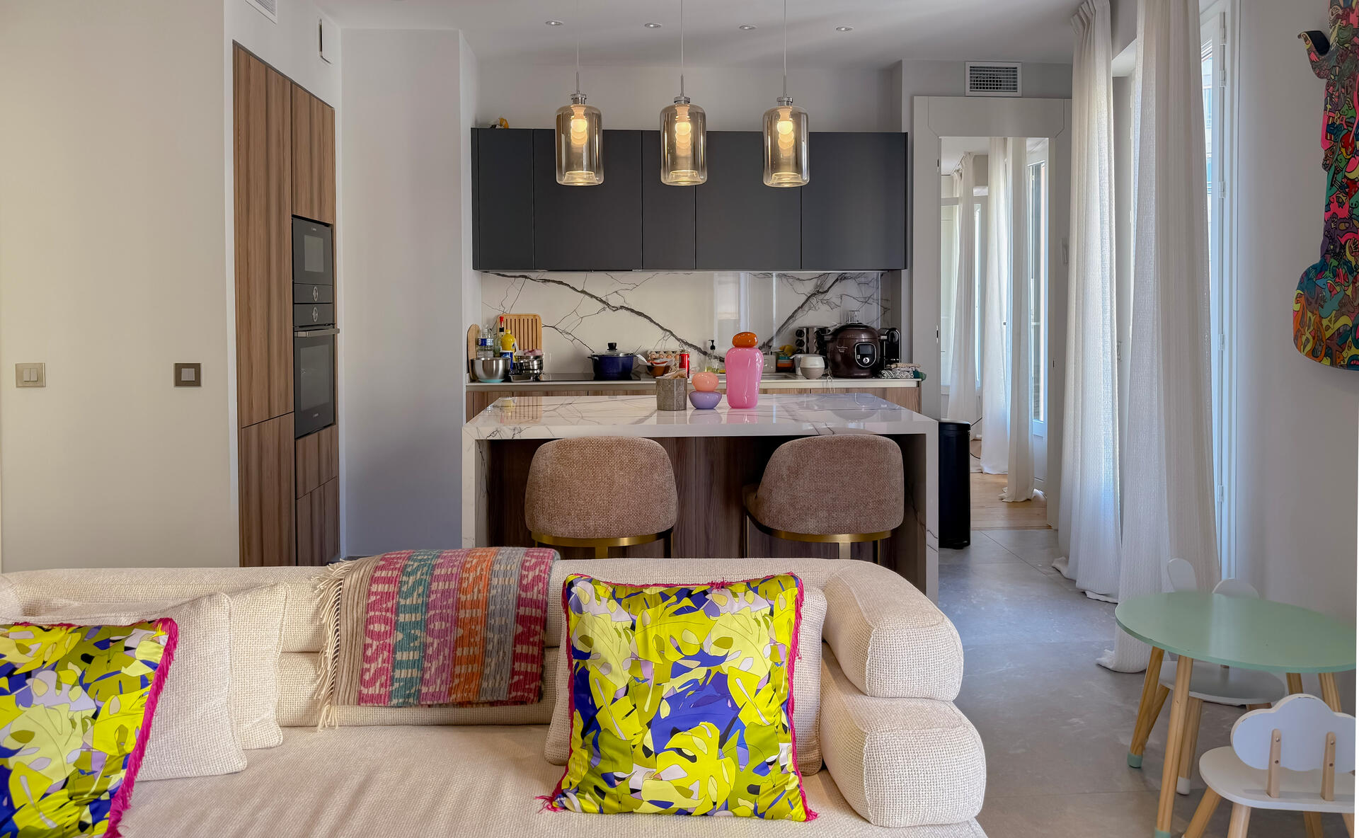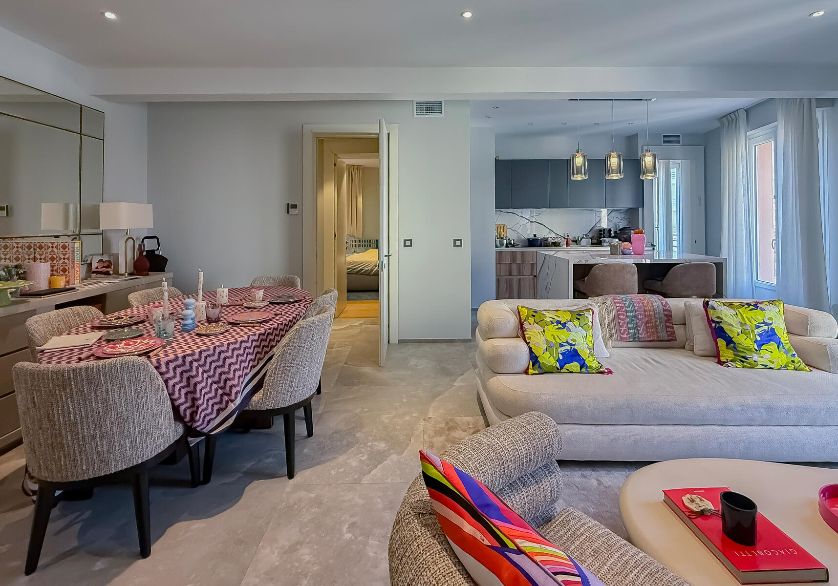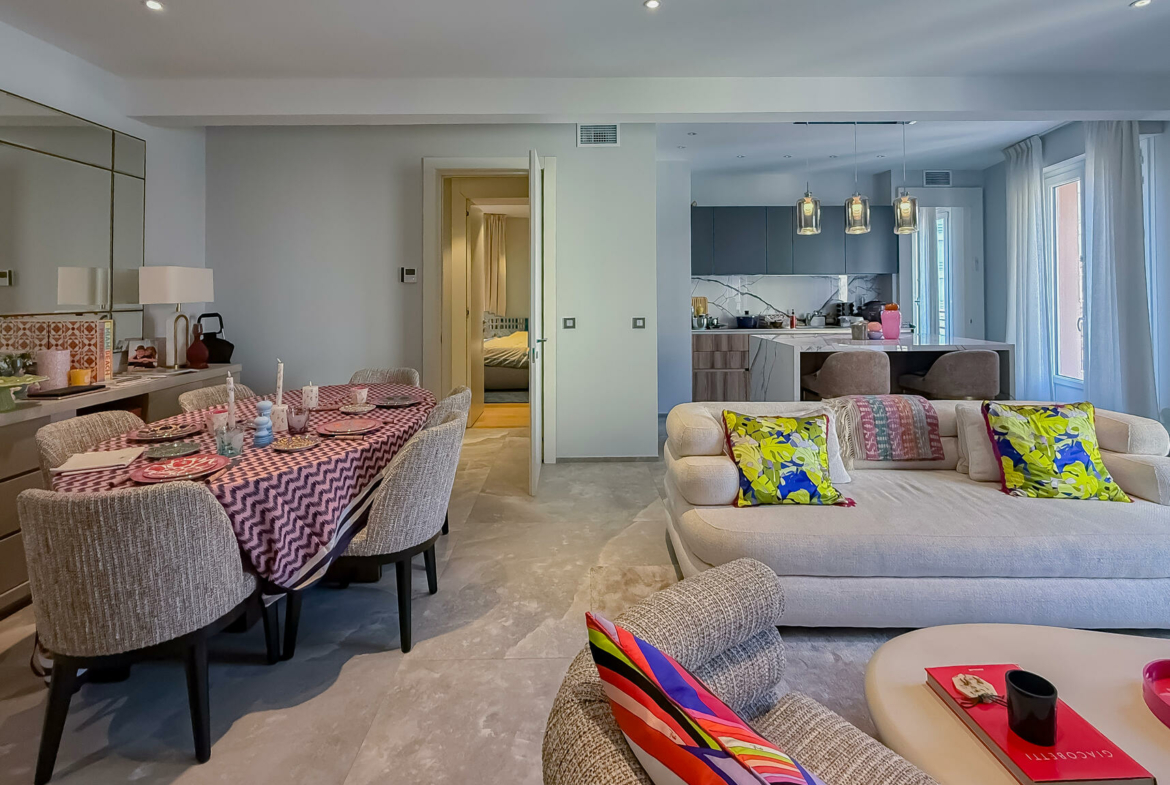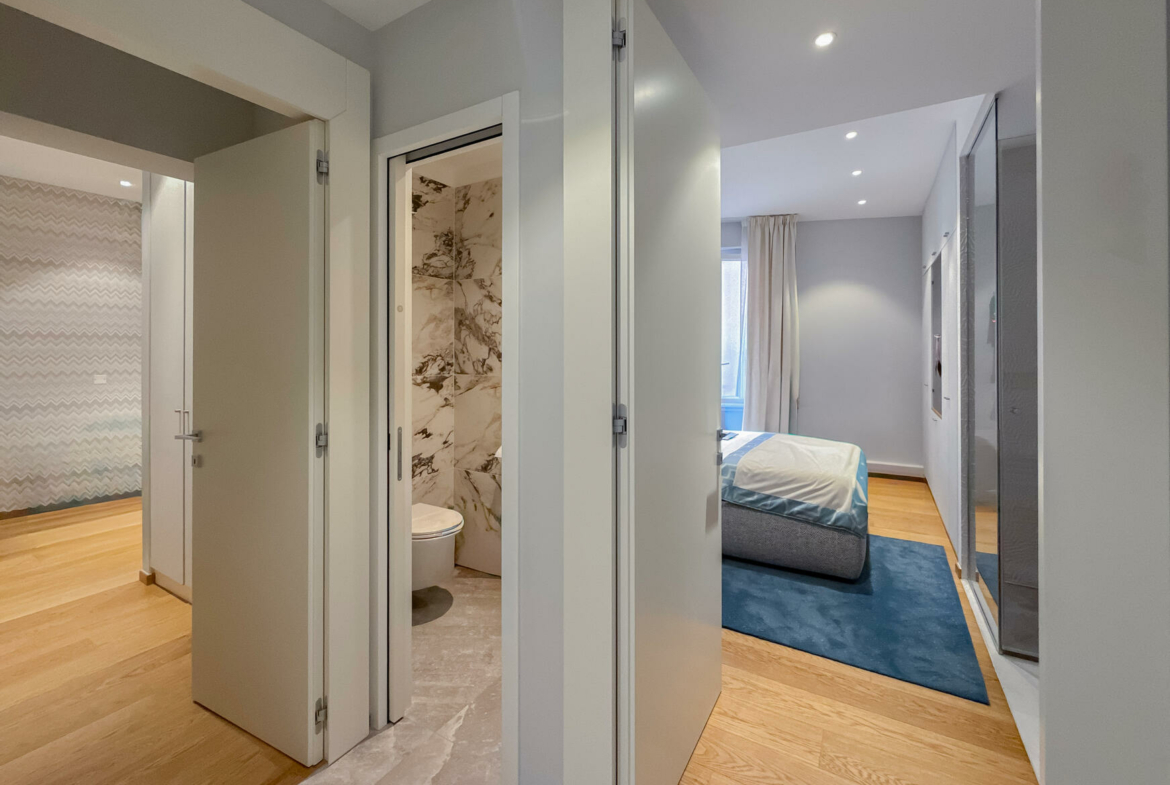 Composed of a large living room with an elegant and friendly American kitchen opening onto a beautiful terrace, as well as three bedrooms with private bathrooms, guest toilets.