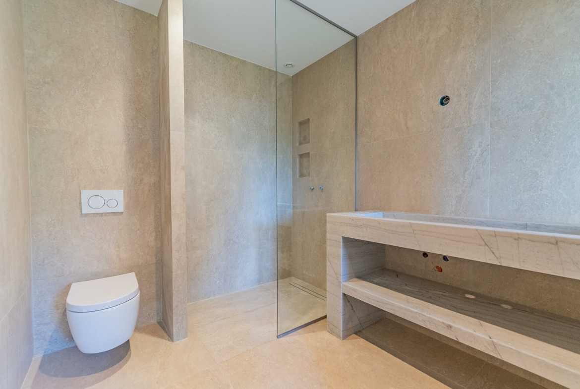 At the pool level, you will find a large bright living room with open kitchen and a guest toilet, all directly opening onto the outside.
